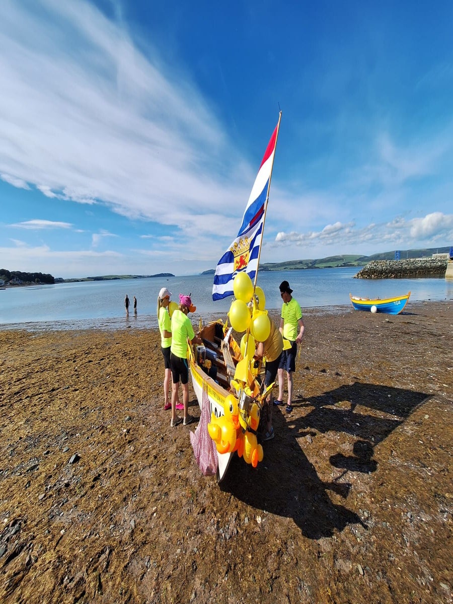 Na wat aansterken in de tent leggen we de Sealainn terug in het water en roeien langs het strand en de kade aan de oostkant van de oude ferryterminal van Stranraer. We zingen Berend Botje en "ik heb mijn wagen volgeladen". Plotseling duikt er een drijvend colaflesje op in het water. Een ideaal oefenobject, dus Yet, stuurvrouw tijdens onze Open Mixed race van morgen, neemt de helmstok over en verricht soepeltjes een goede daad! De Sealainn roeien we naar de boothelling en gaan even het stadje in. Als we terugkomen is het tijd om de Sealainn voor te bereiden op de Daft Duck Day Parade! Dit is speciaal voor ons 'Maureendje' die onze avonturen vanuit Zeeland volgt. We versieren de boot en onszelf met 'onnozele eenden'. Na een Indiase maaltijd op het festivalterrein zijn we om 7 uur paraat voor de parade!