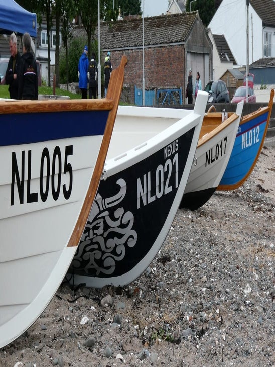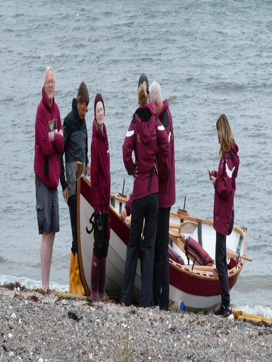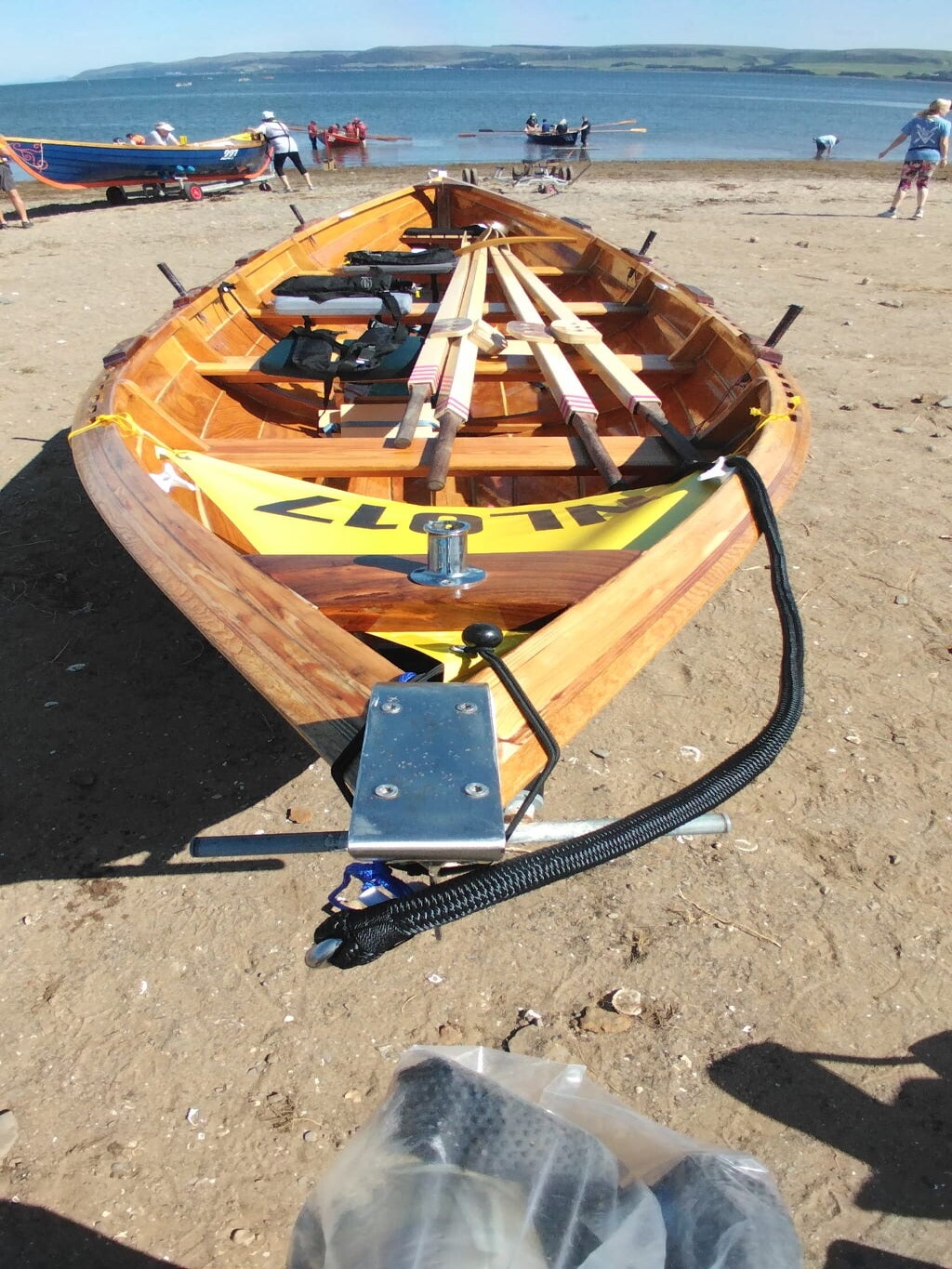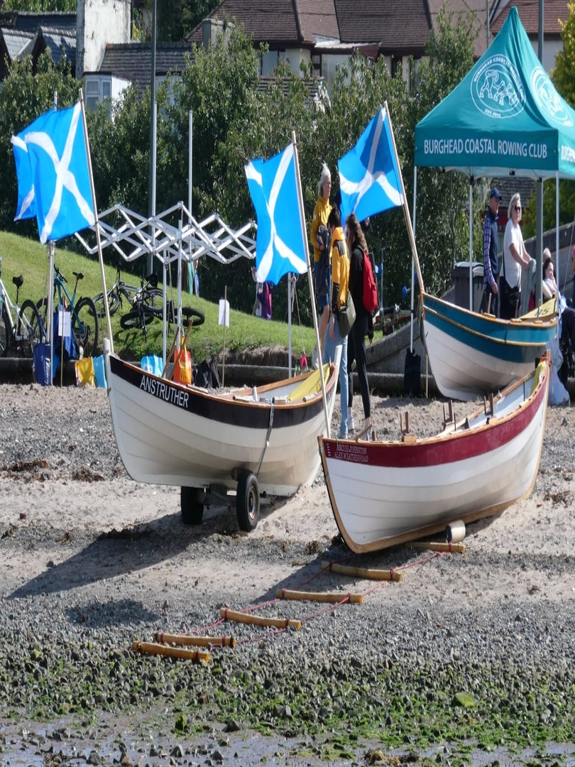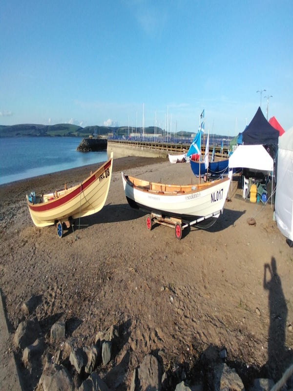 Als we teruglopen naar de auto worden we aangesproken door een Schotse dame, die vraagt of één van ons hen kan helpen met het tillen van hun boot Maggie. Met z'n vijfen springen we bij en tillen de boot op een trolley. In ruil daarvoor vragen we tips aan de stuurvrouw over het ronden van de boei. Daarna helpen wij ze al grappenmakend met het verplaatsen van de skiff op de trolley naar hun 'pitch' op het strand.