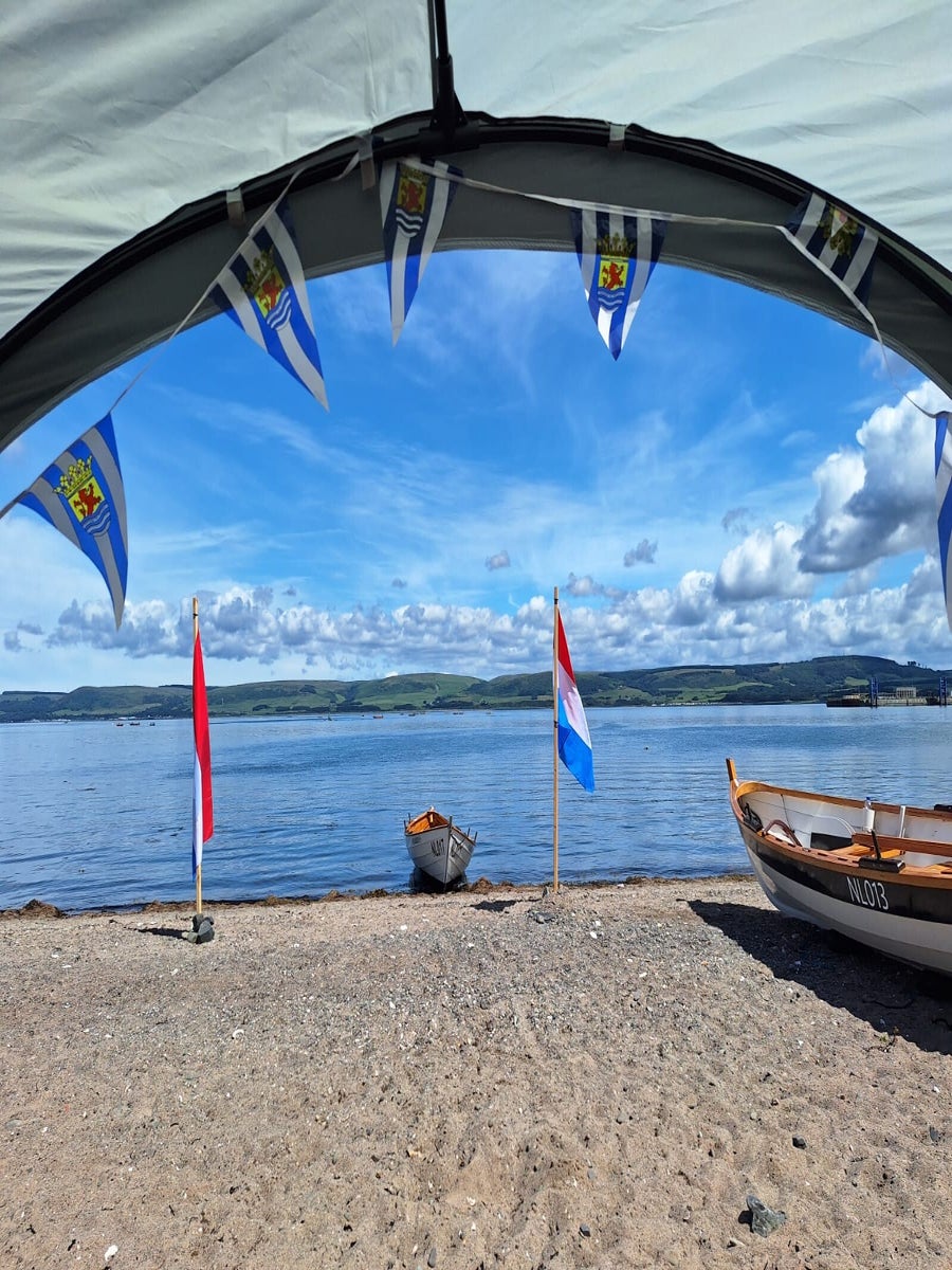 Aangekomen in Stranraer is het al een drukte van belang. We tillen met wat hulp de boot van de trailer en parkeren de trailer op het lokale rugbyveld. Daarna gaan we naar de 'pitch' waar alle Nederlandse teams bij elkaar staan. Pal voor de reddingsbrigade, dus dat voelt veilig! Zonder de handleiding te lezen zetten we de tent op, dit team kan werkelijk alles! Een voorbijgangster waarschuwt voor aantrekkende wind, dus we vervangen het zeil voor een Zeeuwse vlag. Ziezo, hier kunnen we ons thuisvoelen.