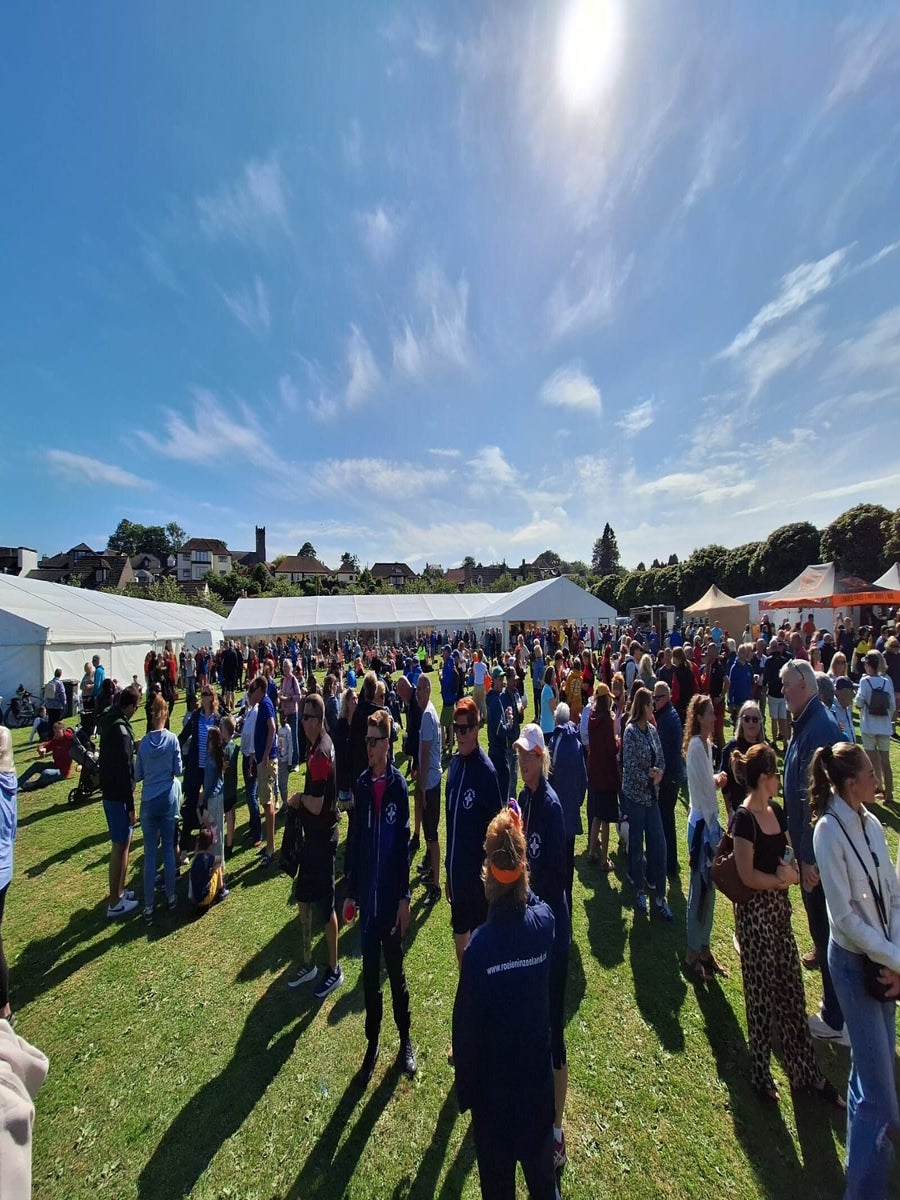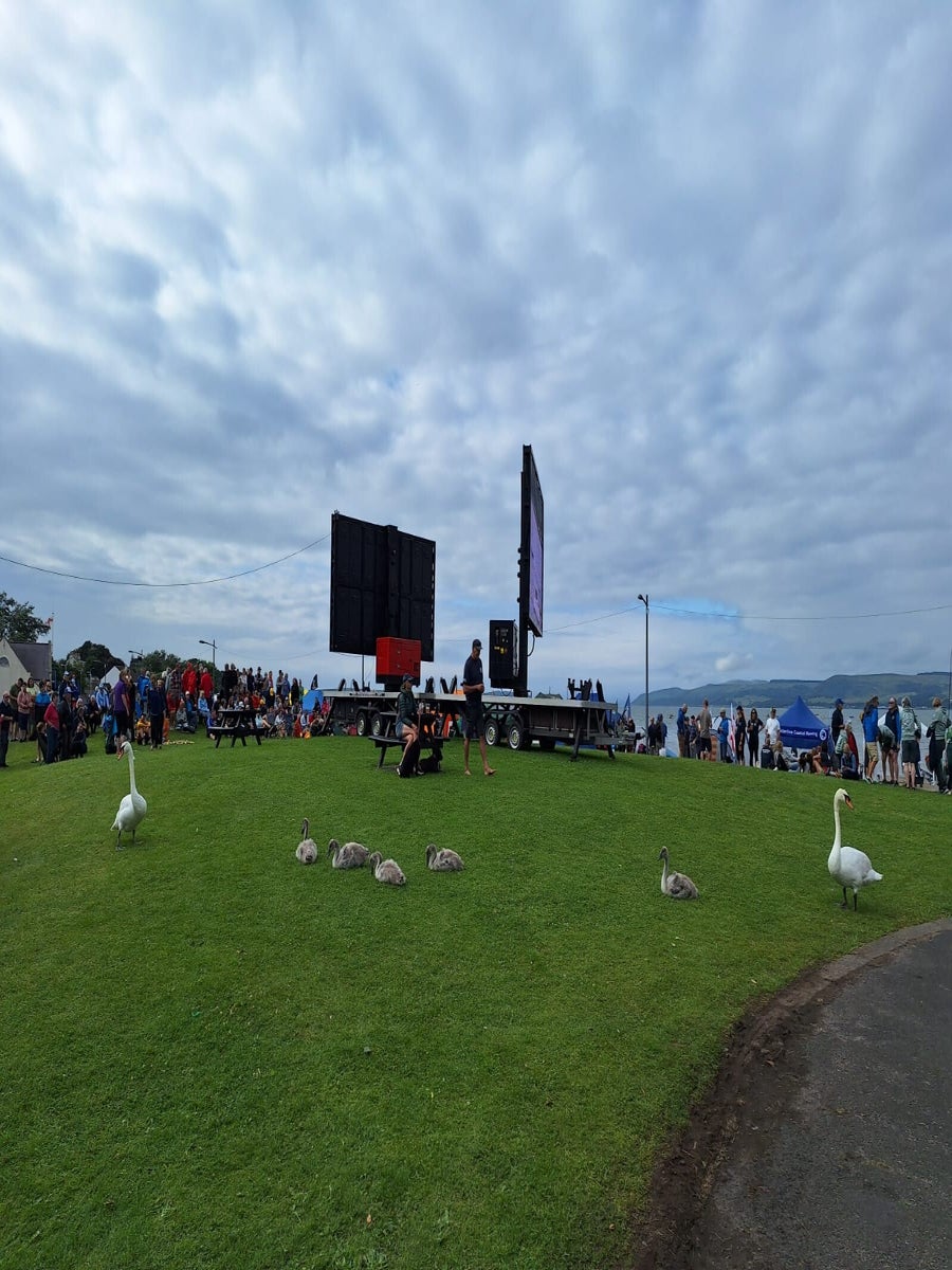 In Stranraer aangekomen zijn de races al volop bezig. Er zijn in het park achter de boulevard grote schermen van sportvolgen.nl met de live stream van de dronebeelden en tracker-posities. Een grote menigte kan hier de races beter volgen dan op het strand of de boulevard! Het beeld wordt door commentators becommentarieerd via luidsprekers die over het hele strand te horen zijn, wat het volgen van de races erg leuk maakt! Onder luid gejuich van de toeschouwende teamleden kijken we goed hoe het veld de boeien rond en over de finish komt. Over twee dagen zijn we hier ook op te zien!