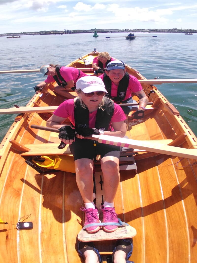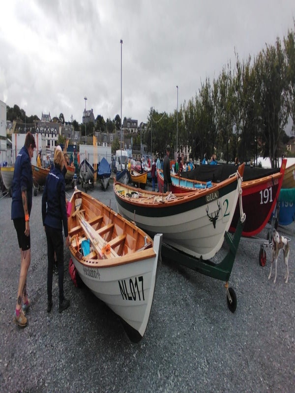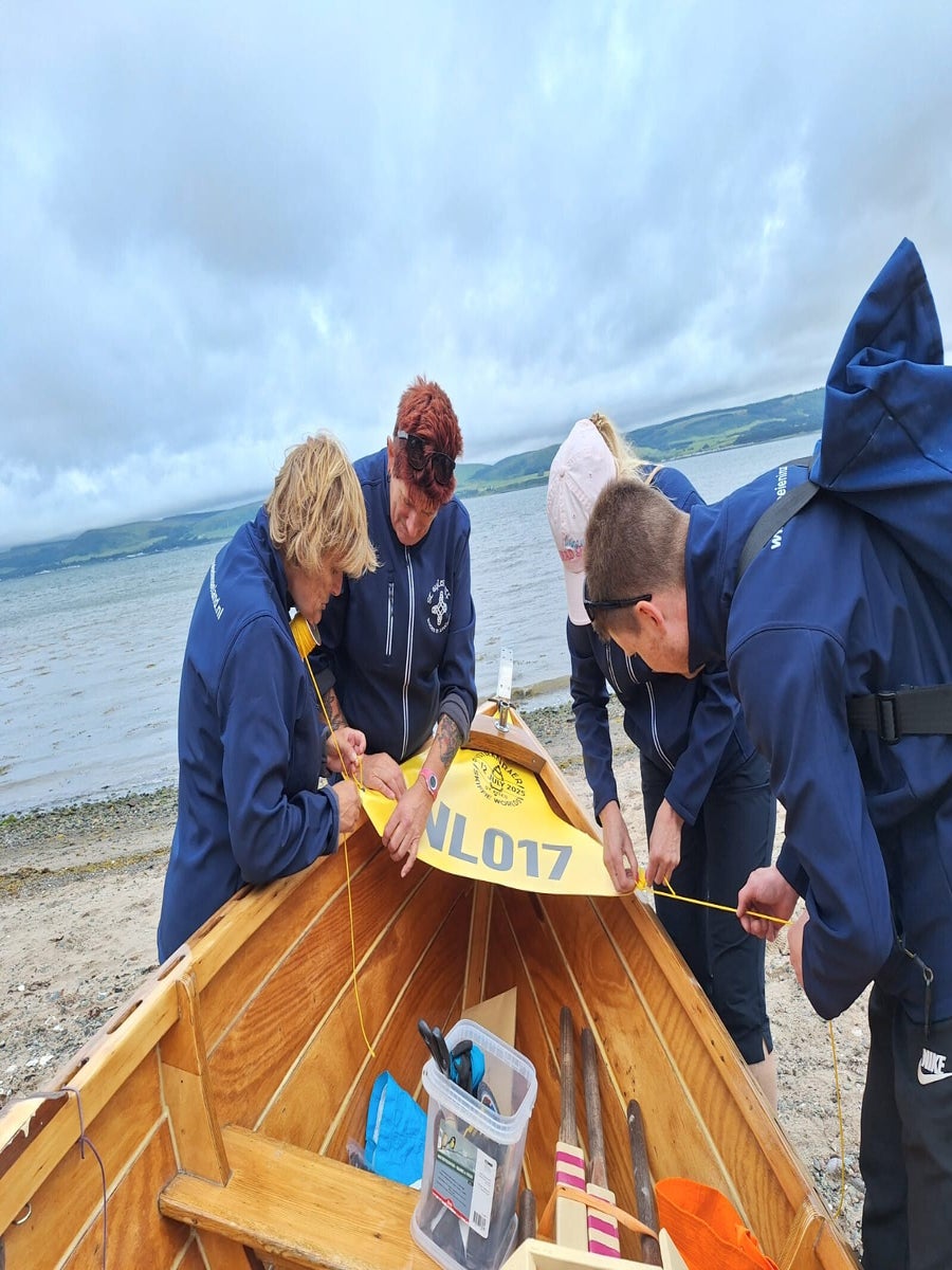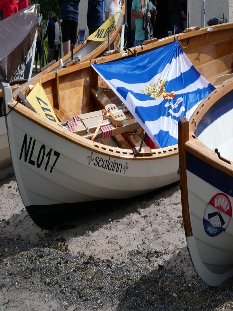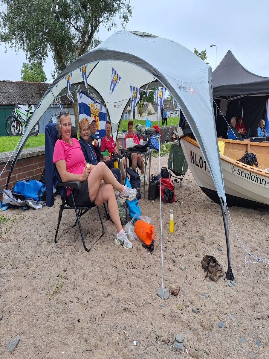 De Sealainn ligt geduldig op haar geleende trolley bij de boothelling te wachten op actie. Een vers opgeladen GPS-tracker van sportvolgen, de verplichte anker met ankerlijn en sleeplijn, nieuw vet op de dolpennen en dolplaten van de riemen, reddingsvesten en roeikussens volgens de gewenste opstelling, betekent dat ze klaar is voor de race. Caroline (slag), Wilma de Vries (bakboord) en Wilma Geelhoed (stuurboord) komen met verse boodschappen en dan is het tijd voor de lunch.