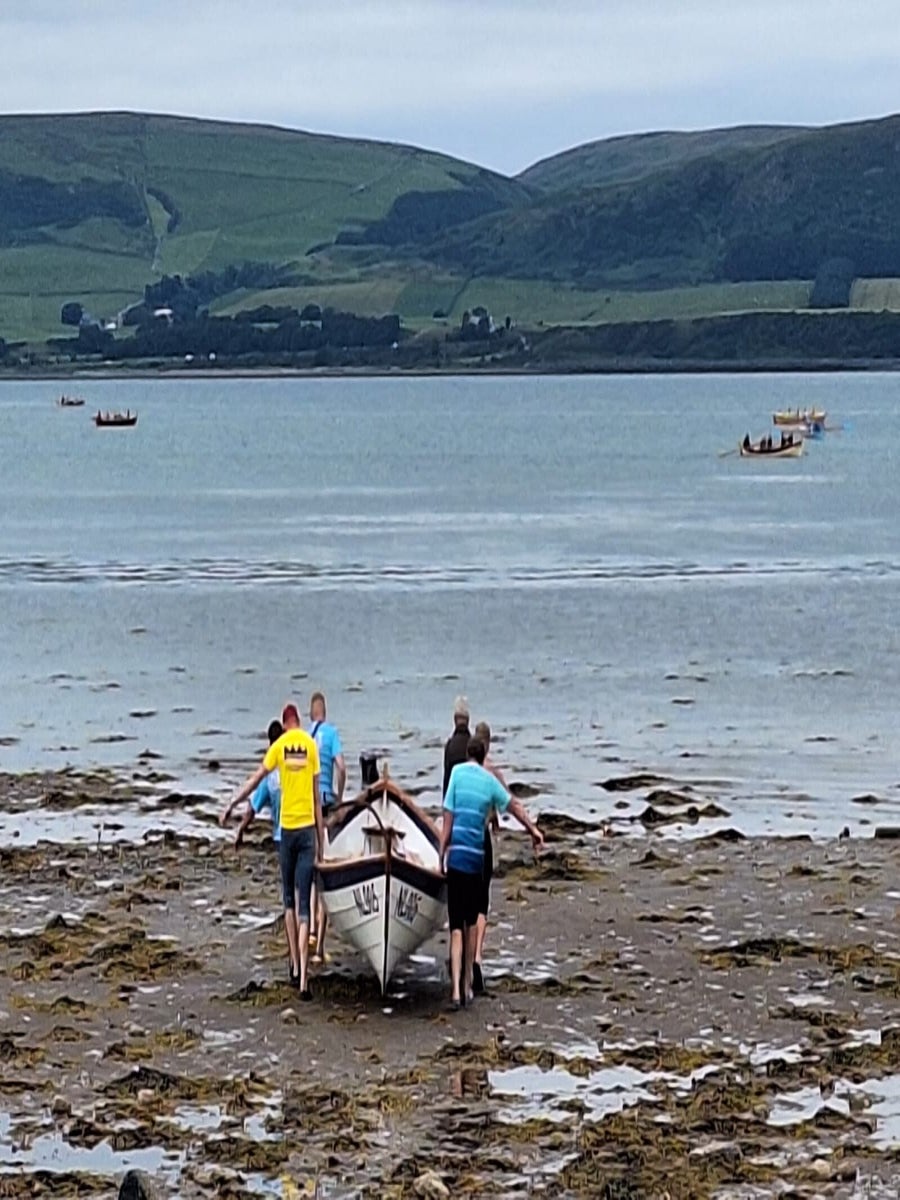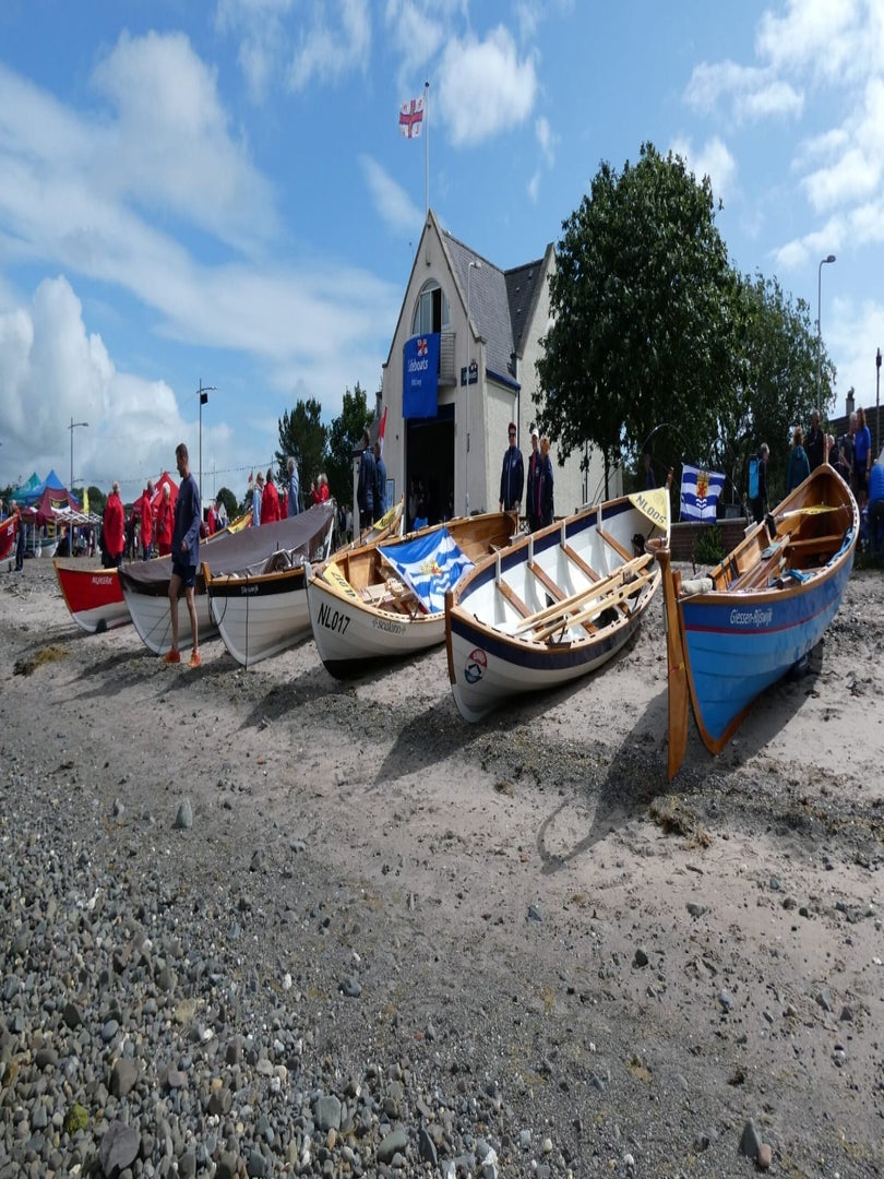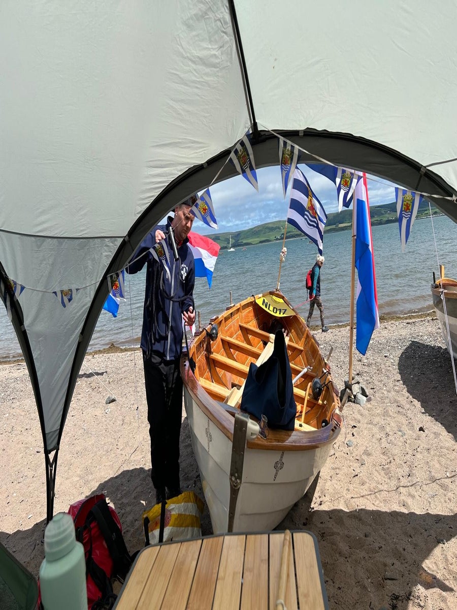 We rollen de boot op een trolley naar onze plek. Onderweg helpen we Ullapool met hun boot op het strand te tillen, waarna zij ons een handje helpen. Het strand wordt steeds voller met Skiffs en tentjes!