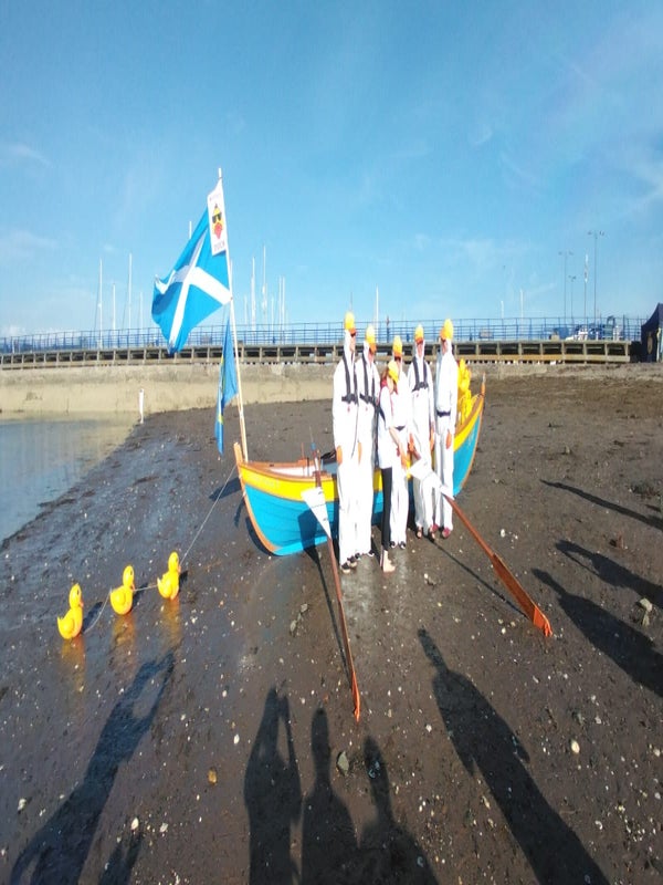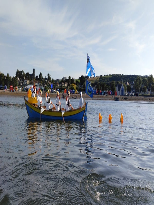 Hoewel er veel mensen in de meest onnozele eenden outfits rondlopen, blijken er slechts drie teams de moeite hebben gedaan om hun versierde skiff te water te laten... Eén van de drie is zo ver het water opgegaan dat ze niet kunnen aansluiten bij de optocht van de twee anderen. Het maakt ons niet uit, dit is onze dag en samen met het Schotse team van Lossiemouth lanceren we onze skiffs, spelevaren we voor het strand en zingen "alle eendjes zwemmen in het water" voor de Schotten. Ze verliezen een donzige eendenpet in het water, maar die pikken wij al roeiend voor ze op en geven 'm terug. Lossiemouth heeft echt uitgepakt, zij roeien zelfs in een stofdichte overall (lekker zweten!) met oranje handschoenen, hebben hun riemen vleugels gegeven en dezelfde opblaaseenden aan hun achtersteven gehangen als wij! Als we weer op het strand staan gunnen we Lossiemouth de 1e prijs voor de Daft Duck Parade en kennen onszelf de 2e prijs toe. Morgen vragen we aan Wendi waar we onze medailles voor de Daft Duck Parade kunnen ophalen!