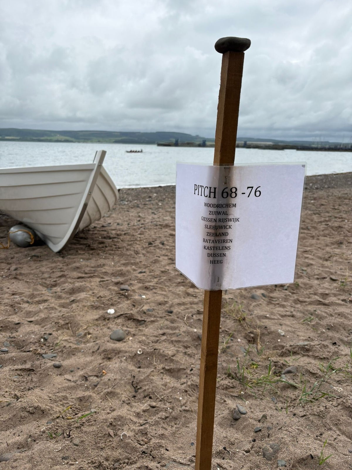 Omdat het eb wordt en daarom voor onze pitch de stenen van het strand tevoorschijn komen, besluiten we bij de boothelling aan de andere uiteinde van het strand aan te landen. Van een Schotse club lenen we een trolley en een paar handen, tillen samen de boot op de trolley en duwen de boot over het mulle zand naar de helling. Vanaf hier volgen we de boulevard helemaal naar het andere uiteinde van het strand om bij onze pitch uit te komen. Met hulp van wat Nederlandse teams leggen we de Sealainn voor onze tent.