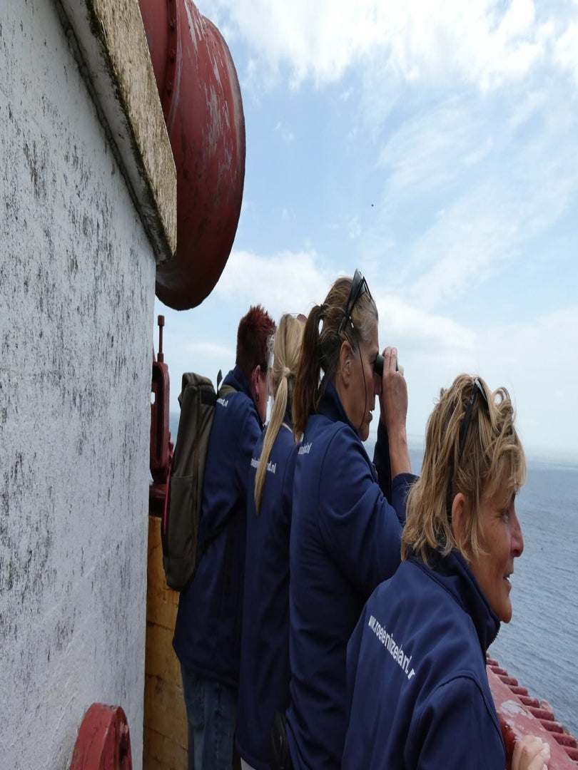 Bij een kleine cottage krijgen we uitleg over de vele broedende zeevogels (er staan camera's op gericht). Daarna gaan we naar de misthoorn en bekijken de vogels met onze eigen ogen. Papegaaivogels zijn vandaag niet te bekennen, ook voor hen waait het vandaag te hard. Daarna is het eindelijk tijd voor een bakkie met een gebakkie (Bannoffee pie) en is het alweer half vier geworden.