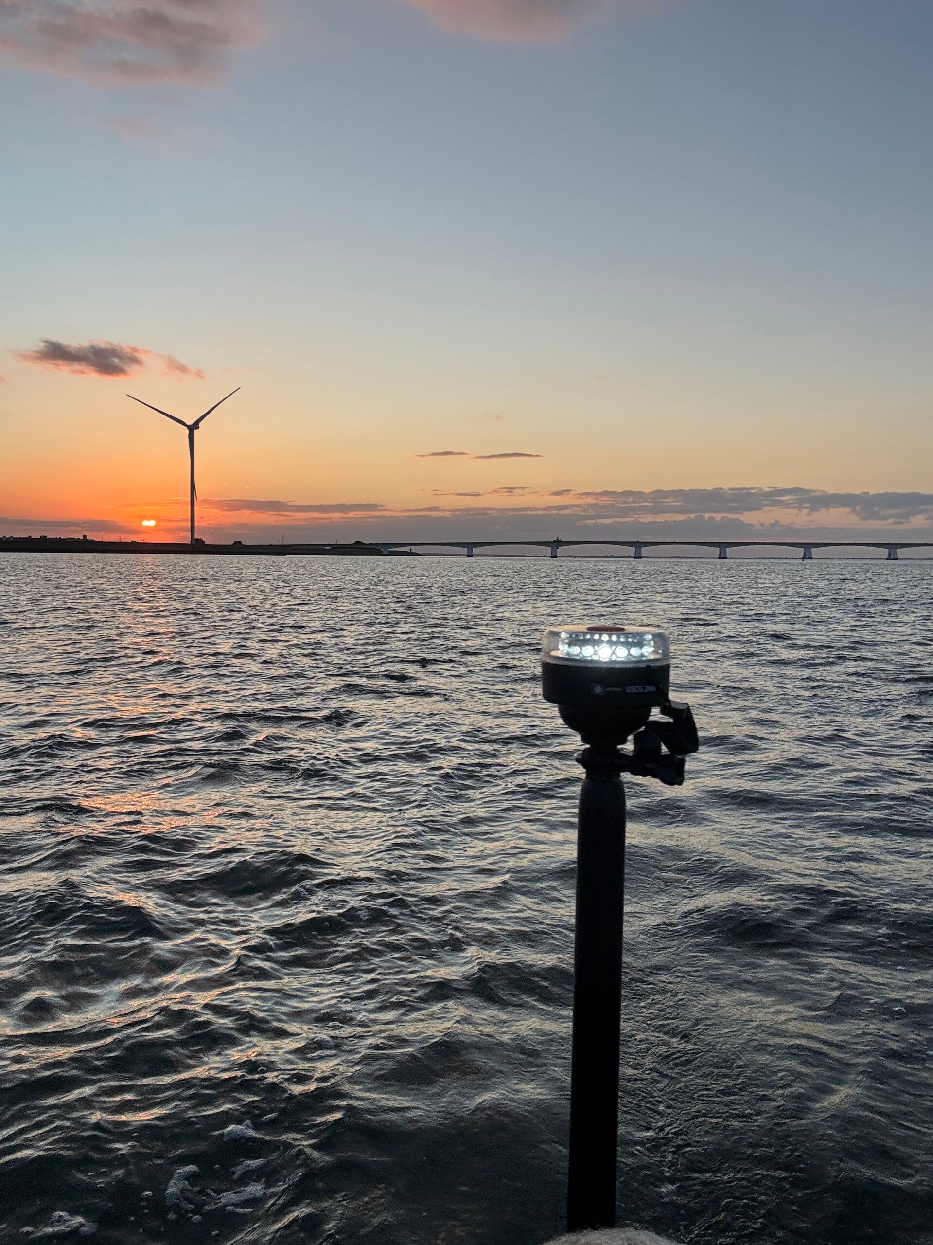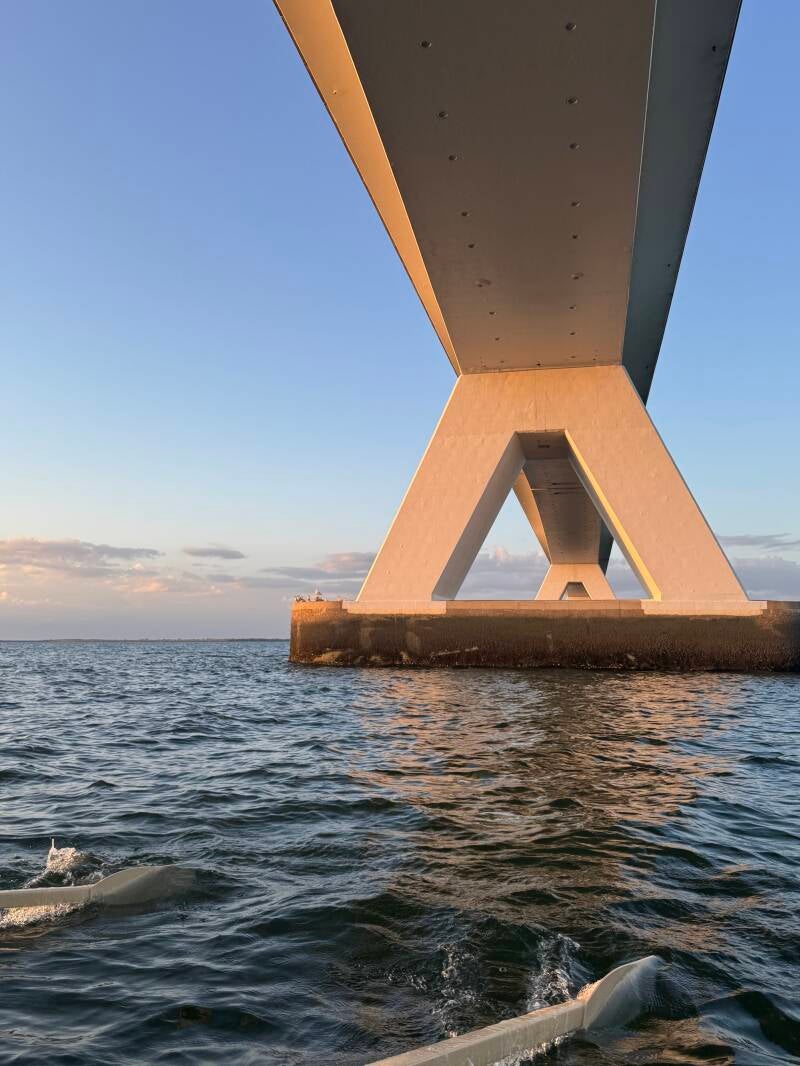 Veel Zeeuwser kan het niet worden! Vanavond roeiden we voor de eerste keer onder de machtige Zeelandbrug door. Vanaf Kats eerst bijna 3,5 km tegen wind en de toenemende vloedstroom in, terwijl de zon langzaam naar de horizon zakte, prachtig! Na het ronden van een pijler ging het - tijdens zonsondergang - voor de wind en volle stroom weer razendsnel terug naar Kats. Een training met een gouden randje!