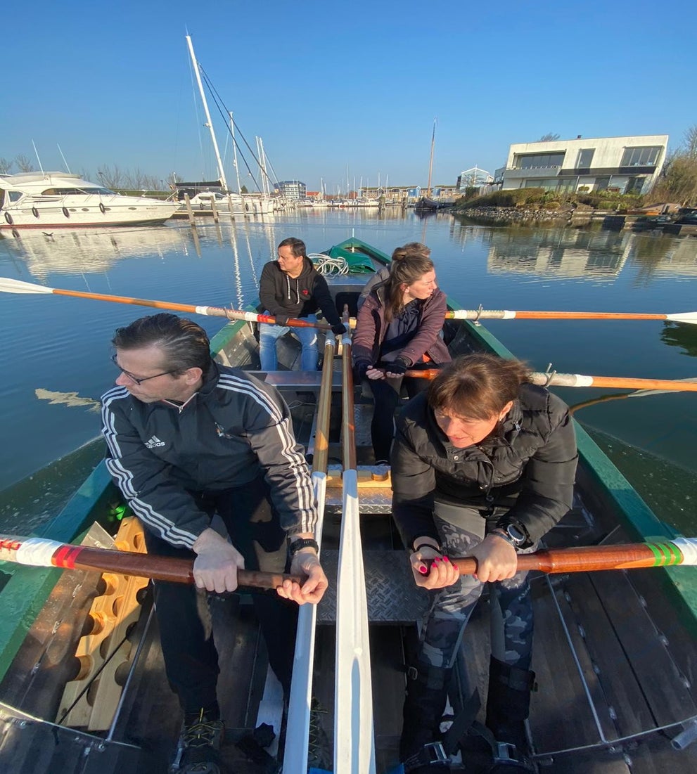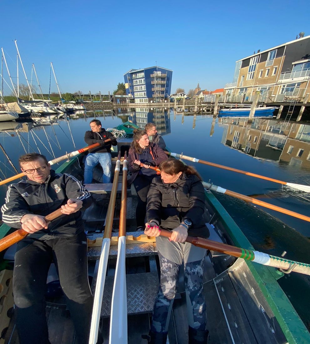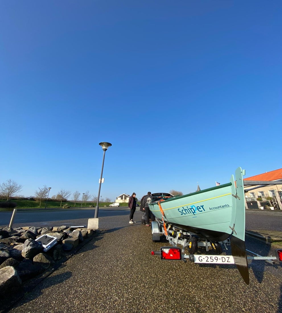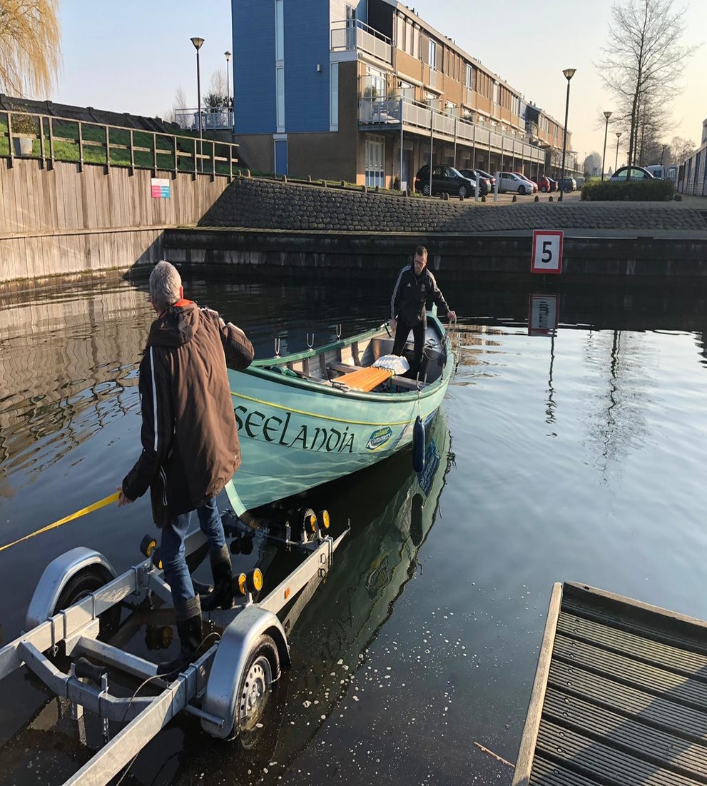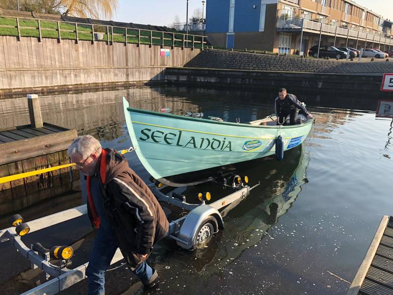 Morgen - 8 maart - gaan we naar Stavoren voor de FSN sleepproef. Om mee te roeien voor het klassement dient iedere roeisloep gesleept te worden, zodat de weerstand door het water bekend is. Met deze sleepwaarde bepaald men tijdens wedstrijden het vermogen per roei(st)er, zodat ongelijke sloepen - groot/klein/hout/polyester/aluminium etc - toch onderling kunnen strijden voor het klassement. We vertrekken morgen om 7:00 uur richting Friesland, dus hebben we vandaag alvast de Seelandia uit het water gehaald.